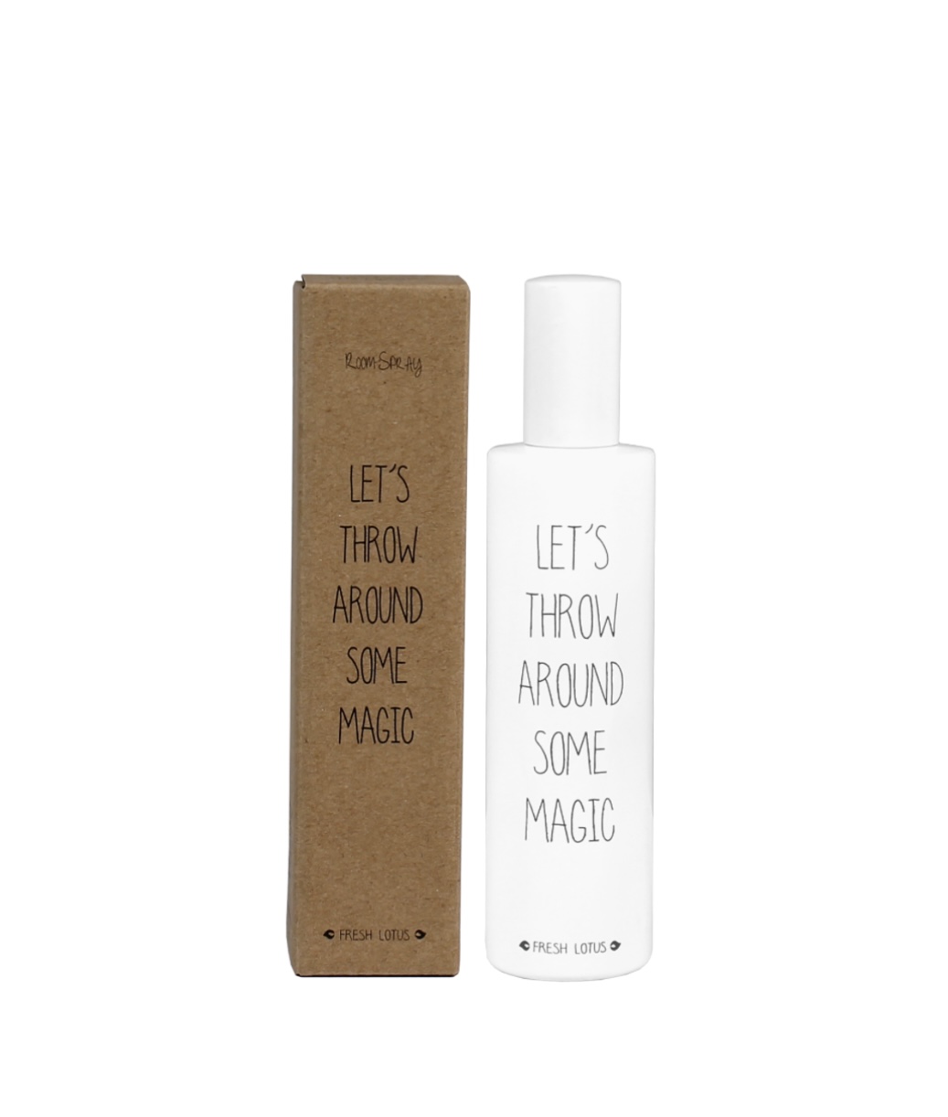 Een zachte en frisse huisspray met de tekst ‘Let’s throw around some magic’.